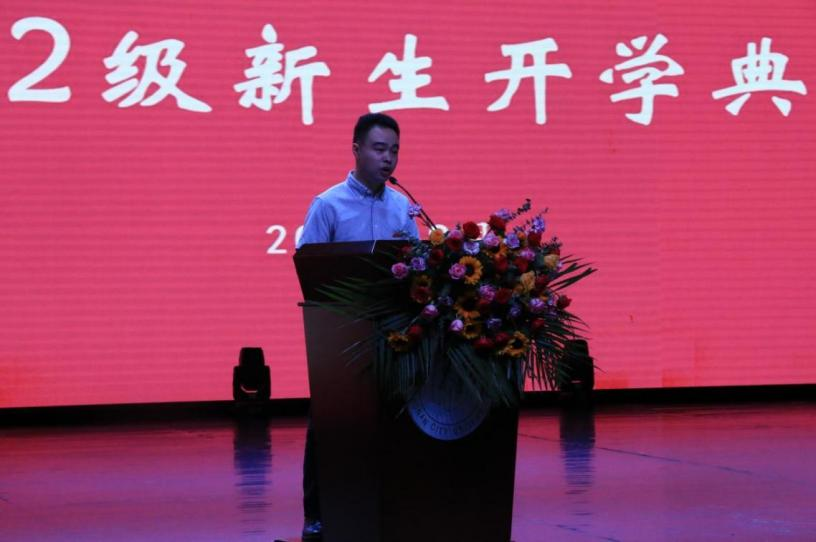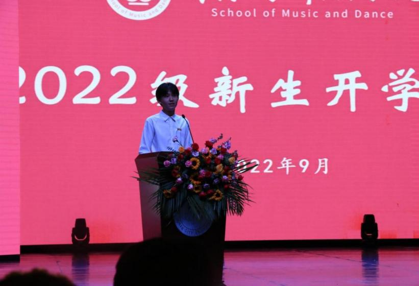 教师代表音乐学系党支部书记周晋博士发言,周晋从老师的视角,对同学们如何在大学阶段完成品德的修炼、知识的积累传授心得,向新生提出“三立”建议,立实现中华民族伟大复兴之志、立“不积跬步无以至千里”之观念、立“品学兼修知行统一”之境界。