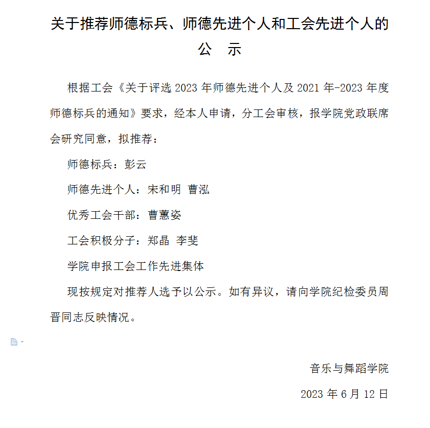 关于推荐师德标兵、师德先进个人和工会先进个人的公示