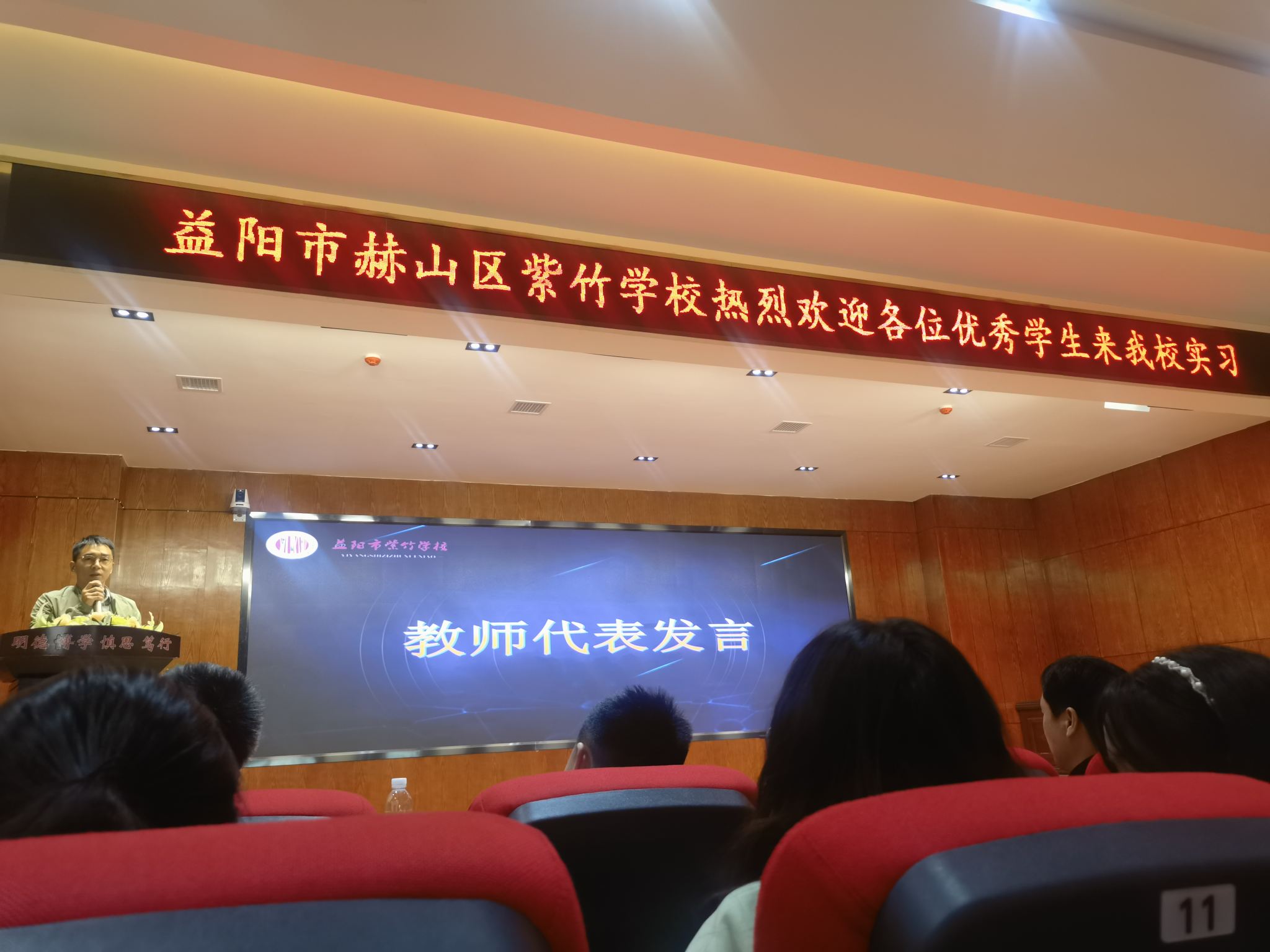 紧接着,教师代表——八年级班主任夏新国老师上台发言,他通过讲述三个生动的小故事,强调了师生间良好关系的重要性,并分享了在日常教学中融入情感教育的有效策略。夏老师还引用了著名教育家陈鹤琴的观点,进一步阐述了“没有坏员工,只有坏老师”的深刻内涵,为实习队员提供了宝贵的启示与指导。