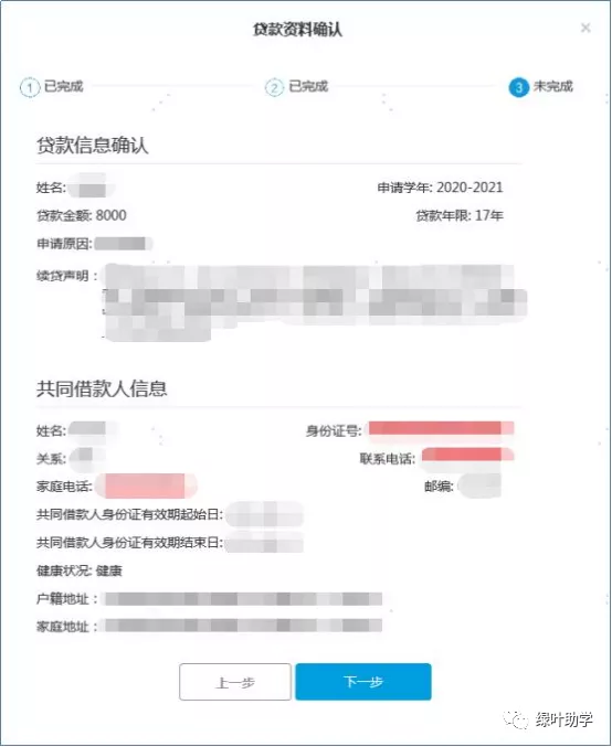 6、填写共同借款人信息后,点击“下一步”对贷款资料进行确认。