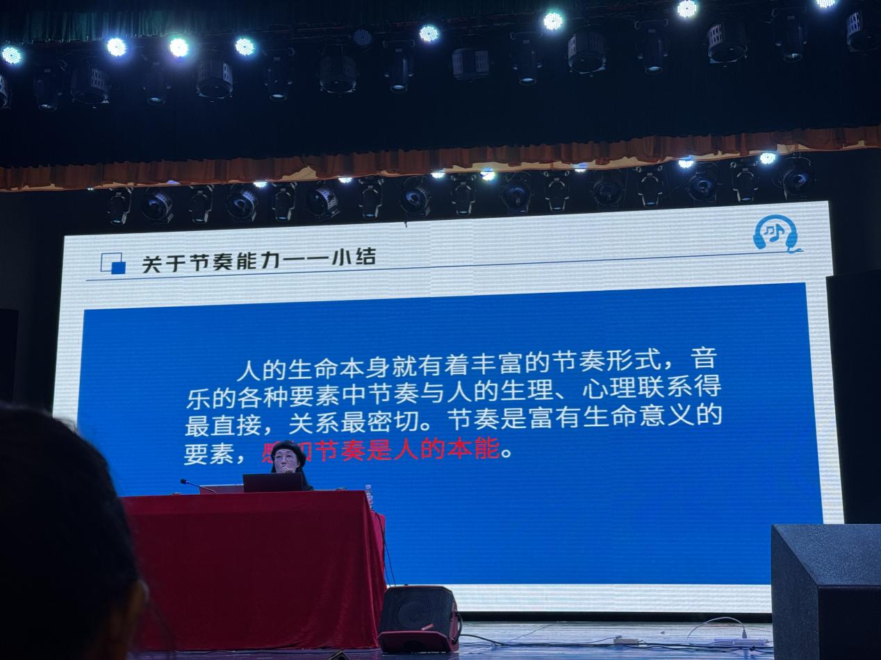 讲座中,邱小燕老师以柯达伊教学法为核心展开讲解,尤其注重理论与教学实际的结合。她明确提出“节奏是人的本能”这一关键观点,详细阐释音乐各要素中,节奏与人的生理、心理联系最为直接密切,是承载生命意义的核心音乐要素,让在场研究生对基础音乐教学的核心逻辑有了更深刻的认知。